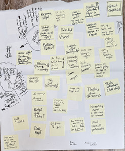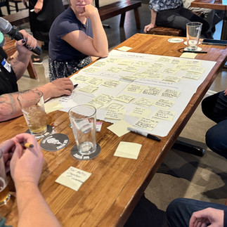 During the idea jam with Golf Garage, participants focused on two main challenges: redefining public perception from retail shop to entertainment destination, and creating inclusive experiences for non-golfers. The session generated over 100 sticky notes with ideas spanning rebranding strategies, themed programming, community partnerships, and innovative uses of their simulator technology.